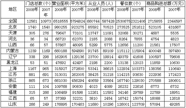 Ⅰ.2007—2008年,上海连锁餐饮企业的门店数目比江苏多很多,但商品购进总额却比江苏少很多,这说明上海人外出就餐比较节省,消费金额很少。
