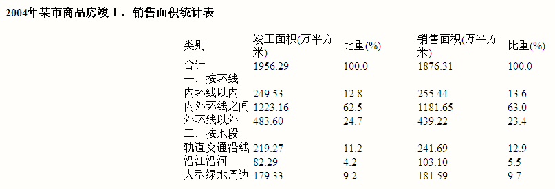 2004年,某市房地产市场供需高位均衡,并呈现供略大于需的合理态势,商品房竣工面积1956.29万平方米,比去年同期增长45.3%;销售面积1876.31万平方米,比去年同期增长21%。供需绝对差额79.98万平方米。10月份,商品房竣工面积348.05万平方米,比去年同期增长1.3倍;销售面积266.98万平方米,比去年同期增长81.6%。从房地产市场供需结构来看,商品住宅、办公楼、商业营业用房和其他用房均表现为竣工面积大于销售面积,其中占全市竣工、销售面积92.4%和95.2%的商品住宅的供需绝对差额为21.92万平方米。