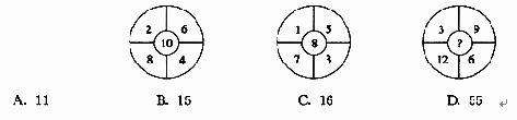 每题图形中的数字都包含一定的规律,请你总结前两个图形中数字的规律,从四个选项中选出你认为问号应该代表的数字。
