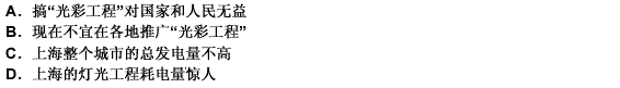 第 37 题近日,有能源专家指出,目前全国不少城市搞“光彩工程”,在当前国内普遍缺电的形势下,这是不适宜的。按照上海电力部门的测算,上海的灯光工程全部开启后,耗电量将达到20万千瓦时,占整个城市总发电量的2%,相当于三峡电厂目前对上海的供电容量。这段文字的主旨是( )。