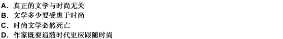 第 13 题我们不拒斥时尚,并乐于承认自己在生活中还曾受惠于时尚。但说文学不能脱离时代与不能脱离时尚,其间区别是巨大而本质的。因为作家不是模特、艺人或设计师,他可以追随时代,但永远不能攀附潮流。因为跟着潮流亦步亦趋,只能使他变成一个受塑者而做不成创造者。并且,这种随潮流旋趋旋弃,力求尽人而悦之,必然会使他丧失独立的个体意志,既不能复苏一种精神,又难以启迪更有意义的人生,最终不是在畅销中迷失,就是在时尚中死亡。这段话的主旨是( )。