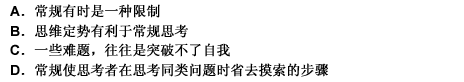 第 29 题现在,人们普遍使用电动机,这在众多机电专业人员的头脑中逐渐形成了一种思维定势。这种“一定之规”却使人们在遇到有些问题时不得其解。如日本一家公司开始设计一种小型自动聚焦相机时,在照相机里装进电动机以后,体积小不了,重量轻不了。如果要为它再去特别设计一种专用的超小型电动机,时间又很难保证。为此,设计人员大伤脑筋。后来,一个不是学电机专业的技术人员想到用弹簧取代电动机,结果解决了这个难题,“傻瓜相机”很快问世。