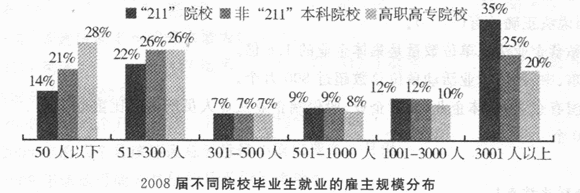 - A.在规模为3001人以上的雇主就业的“211”院校毕业生多于高职高专院校的毕业生