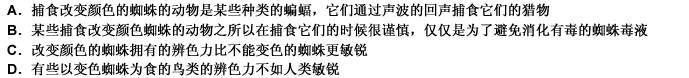 第 90 题许多种蜘蛛都会按照它们所附在花的颜色去改变自己的颜色。与人类不同,被那些蜘蛛捕食的昆虫拥有敏锐的颜色鉴别能力,可以辨别出这种伪装。那么,显然蜘蛛的颜色改变是为了躲避自己的天敌。下列哪一项如果正确,最能支持以上论述?( )