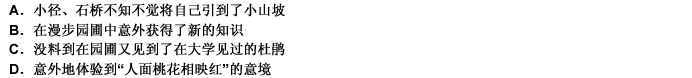 第 43 题步入园圃,两旁葵、竹像列队欢迎,前面的桃花正迎风含笑。足迹走遍半个地球,还是第一次面对“人面桃花相映红”的境界。黄竹给我添上一份新知,使我感到学无止境。穿过路亭、小径,走过石桥、水榭,漫步到一座小山坡前,山坡上的杜鹃红白相映,使我忆起大学时代的杜鹃城。世界的变迁,人生的境遇,真是谁也不能预料。我们必须坚守着自己的岗位,才不会愧对时间与历史。