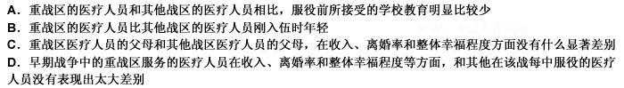 第 75 题最近一次战争里在重战区中执行任务的医疗人员,即使是那些身体未受伤害的,现在比在该战争不太激烈的战斗中执行任务的医疗人员收入低而离婚率高,在衡量整体幸福程度的心理状况测验中得分也较低。这一证据表明即使是那些激烈的战争环境下没有受到身体创伤的人,也会受到负面影响。