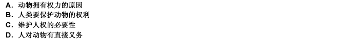 第 15 题动物是否有权利不在于它们能否推理,也不是它们能否说话,而是它们能否感到受苦。我们踢了一下石头,说这样做不符合石头的利益,这样说没有意义,因为石头没有受苦的能力。但动物不一样。你踢一下猫,它叫一声跑开了,我们知道它受苦了。大家可以看到一些现象,就是猫.狗等动物在长期受到虐待,它们的神经非常痛苦以后,整个状态都会改变。有的猫在受到虐待后逃出来,成为野猫,你要再收留它就很困难,需要经过长期的心理调适。受到虐待的动物和受到宠爱的动物是不一样的,这和人一样。