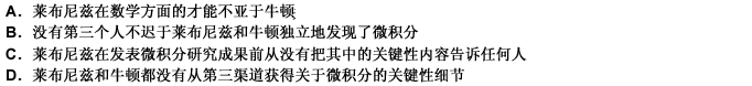 第 75 题莱布尼兹是17世纪伟大的哲学家,先于牛顿发表了自己的微积分研究成果。但是当牛顿公布了他的私人笔记,说明他至少在莱布尼兹发表其成果的10年前已经运用了微积分的原理。牛顿还说,在莱布尼兹发表其成果的不久前,他在给莱布尼兹的信中谈起过自己关于微积分的思想。但是事后的研究说明,牛顿的这封信中,有关微积分的几行字几乎没有涉及这一理论的任何重要之处。因此,可以得出结论,莱布尼兹和牛顿各自独立地发现了微积分。