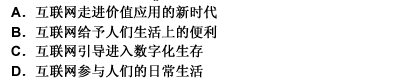 第 8 题从“娱乐化应用”到“价值应用”,互联网为我们的日常生活提供着实实在在的服务,中学生的“网络课堂”,大学生求职的“网申”,农民土特产的“网络推销”,都市白领的网上“淘宝”……互联网的价值应用正在走近每一个人:更有专家预言“数字化生存”的诱人前景。 对文义概括最准确的是( )。