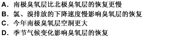 第 13 题南极臭氧层的恢复可能要到2065年。科学家研究表明,氯、溴排放的下降速度没有预期的那样快。今年9月南极臭氧层空洞的面积达到1 000万平方英里大小,相当于整个北美洲。北极臭氧层的破坏程度小于南极,北极臭氧层的恢复可能要到2040年。南极冬季的严寒导致氯转化成另外的形式,对臭氧层的破坏更大,而北极的冬季则比较温暖。