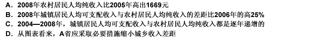 第 72 题以下关于2004—2008年A省城镇居民人均可支配收人和农村居民人均纯收入的描述不正确的是( )。