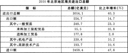 2010年全年,北京地区进出口总额3014.1亿美元,比上年增长40.3%。其中出口554.7亿美元,增长14.7%;进口2459.4亿美元,增长47.8%。“十一五”期间,北京地区进出口总额累计达到11389.3亿美元,是“十五”时期的2.9倍。其中出口2482亿美元,进E1 8907.3亿美元,分别是“十五”时期的2.7倍和3倍。