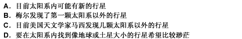 第33题旧金山州立大学天文学家马西曾发现几颗太阳系以外的行星。但他最近说,目前还不能探测到如地球大小甚至土星大小的行星。他还说,一般来讲,这些行星都是围绕某一颗恒星旋转的。上个月宣布的最新发现是目前发现的太阳系以外最小的行星,质量是木星的一半,每3.5天绕HD75289(18)转一周,是由日内瓦天文台的瑞士天文学家梅尔等人发现的。梅尔在1995年报告说,他们发现了第一颗太阳系以外的行星。
