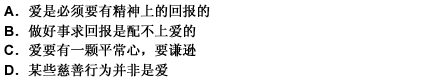 第 14 题投入就必须要有回报。爱也是一种投入,所以爱也是要有回报的,不给物质上的回报,也必须给精神上的回报。某些人慈善行为的这种功利性甚至是商业性,我们其实有些习以为常,而不以为怪。做了一点好事,生怕天下人不知道;做了一点好事,就自以为高人一等;做了一点好事,就自以为有了某种特权;做了一点好事,就要马上变现。这很傲慢,很粗暴,很自私,能配得上爱这个字吗?我很怀疑。