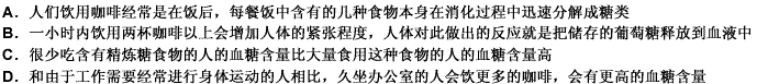 第 82 题一个人摄取的精炼糖和在消化过程中由食物分解成的糖就是进入人体血液的几乎所有葡萄糖(一种糖)的饮食来源。虽然咖啡在消化时自身不能分解成糖,但有时却能使人的血糖水平急剧上升,即使咖啡没有和奶油或任何甜食一起饮用。