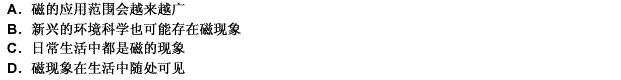 第 32 题磁,是一种非常普遍的现象,在我们的日常生活中随处可见。从电子设备、电力系统到通讯自动化控制,无处不用到磁效应和磁性材料。而随着磁技术的发展,其应用范围更扩展到生物科学、农林科学及至新兴的环境科学等领域中。从这段文字我们不能推出的是( )。
