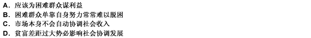 第 31 题有些群众生活困难,虽有发展潜力,但现在难以靠自己改变目前的处境,需要扶一把。有人认为,资源和就业的配置要通过市场解决,政府不好包办。但市场不可能自动实现社会收入的公平与协调,也不可能顾及全社会的扶贫救弱。假如困难群体陷于无助,贫富差距过大,无疑会影响社会的协调发展。这段话支持了这样一个观点,即( )。