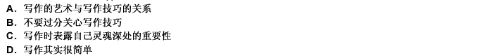 第 35 题写作的艺术是比写作艺术的本身或写作技巧的艺术更广泛的。事实上,如果你能告诉一个希望成为作家的初学者,第一步不要过分关心写作的技巧,叫他不要在这种肤浅的问题上空费工夫,劝他表露他的灵魂的深处,以冀创造一个为作家基础的真正的文学性格;如果你这样做,你对他将有很大的帮助。当那个基础适当地建立起来的时候,当一个真正的文学性格创造起来的时候,风格就自然而然地成形了,而技巧的小问题便也可以迎刃而解。