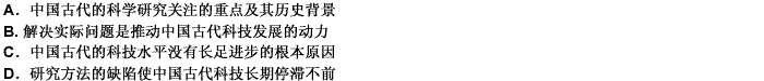 第 48 题中国古代的科学著作大多是经验型的总结,而不是理论型的探讨,所记各项发明都是为了解决国家与社会生活中的实际问题,而不是试图在某一研究领域获得重大突破。从研究方法上来说,中国科技重视综合性的整体研究,重视从总体上把握事物,而不是把研究对象从错综复杂的联系中分离出来,独立研究它们的实体和属性,细致探讨它们的奥秘。这使得中国古代的科学技术没有向更高层次发展。