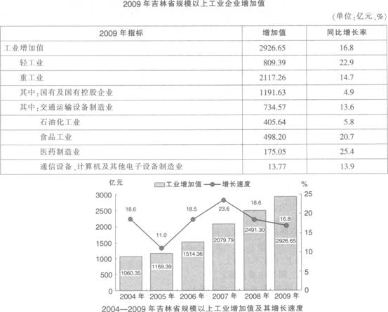2009年,吉林省规模以上工业企业完成增加值2926.65亿元,按可比价格计算,增长16.8%,增幅高于年初规划目标1.8个百分点。其中轻工业实现增加值809.39亿元,增长22.9%;重工业实现增加值2117.26亿元,增长14.7%。