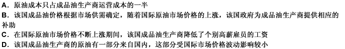 第 77 题成品油生产商的利润很大程度上受国际市场原油价格的影响,因为大部分原油是按国际市场价购进的。近年来,随着国际原油市场价格的不断提高,成品油生产商的运营成本大幅度增加,但某国成品油生产商的利润并没有减少,反而增加了。