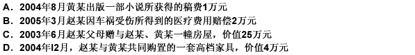 第 105 题赵某与黄某于2003年1月结婚,2005年10月协议离婚,但在财产分配上发生争议,下列不属于夫妻共同财产的是:
