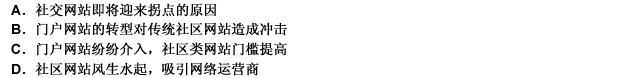 第 14 题中国雅虎推出社交网站标志着该行业正迎来拐点。Facebook的出现让社区网络被人们所熟知。随着网易“梦幻人生”浮出水面,又有一家传统门户网站进入了社区网站领域。业内人士分析,门户网站拥有充足的资金,它们的加入将对传统社区网站造成不小冲击,并提升市场进入门槛,而国内社区类网站或许将步入一个新的“富翁”时代。以此段作为开头的一篇文章,最有可能讨论的问题是( )。