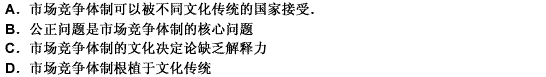 第 6 题人们是否接受,或在多大程度上接受市场竞争体制,与其说是个文化差异问题,毋宁说是个历史案例问题,即竞争是否公正的问题。文化传统差异极大的拉美、俄国、伊朗都有强大的公众反竞争运动,而文化类型相同的美英则此无彼有。可见回避竞争是否公正而专在“文化传统”、“深层心理”上做文章,是多么缺乏说服力。这段文字意在说明( )。