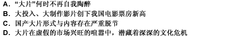 第 23 题以大投入、大制作、高调造势、高票房回报为标志的“大片”,近几年在中国影坛上出尽风头。岁末年初开始的《满城尽带黄金甲》全线飘红,以3.5亿元的票房创下了中国电影史上的票房新高。包括这部片在内的5部影片,占去了2006年中国电影全部26.2亿元票房收入的1/5还多。但舆论和观众大多给予批评和表示不满。深究起来,“大片”自身在选材、制作和市场开发方面的诸多误区当是最直接的诱因。从《英雄》、《无极》、《十面埋伏》、《夜宴》到《满城尽带黄金甲》,国产包括与港台合拍大片几乎是清一色地选择了古装加武打、阴谋加爱情之类型,出现形式奢华和内容空洞的强大反差。这段文字意在说明( )。