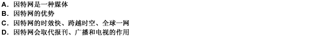 第 24 题因特网作为一种媒体,与19世纪的报刊和20世纪的广播、电视不同的是:跨越时空,全球一网,信息无限,时效更快;文、图、动画、声音等多种媒体为一体;每个人可选择自己所需要的内容,发表意见,每一个新闻机构甚至个人都可以随时向全世界发布新闻。