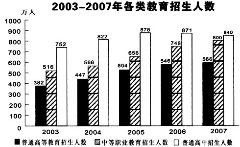 - D.因为考大学相对容易了,所以2003-2007年普通高中招生的人数越来越多