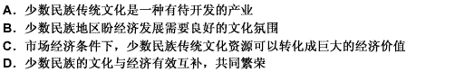 第 26 题把少数民族传统文化作为一种产业来开发,将文化资源全面推向市场,使少数民族传统文化成为市场运行大环节中的一个有效组成部分。而传统民族体育、传统文艺表演、传统人文景观,都将可以成为企业营销的好场所。因为,少数民族地区的经济发展不仅要靠引进外资,提高产品的技术含量,建立高效的激励机制等等,而且需要一个良好的企业形象。一个企业的形象效果以及产品的营销战略不仅重要,而且文化与经济将有效互补,共同繁荣。