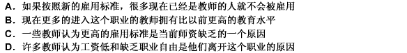 第 67 题日益苛刻的雇用标准并不是目前公立学校师资缺乏的主要原因,教师的缺乏主要是由于最近几年教师们的工作条件没有任何改善和他们薪水的提高跟不上其他职业薪水的提高。以下哪一项将最能支持以上所述观点?( )