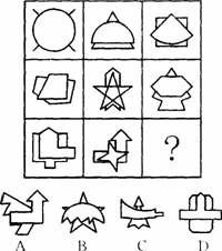 三、图形推理。共10题,每题1分,共10分。每道题包含问题图形和可供选择的四个图形。问题图形具有一定的规律。也存在某种差异。要求你从四个选项中选择你认为最适合的一个。你要从中找出其变化规律,并把这种规律正确地运用到解题过程中,或者依据图形变化的规律进行选择。