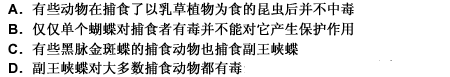 第 45 题黑脉金斑蝶的幼虫以乳草植物为食,这种植物所含的毒素使得黑脉金斑蝶对于一些捕食它的动物来说有毒。副王峡蝶的外形和黑脉金斑蝶非常相似,但它的幼虫并不以乳草植物为食。因此可以得出结论,副王峡蝶之所以很少被捕食,是因为它和黑脉金斑蝶在外形上的相似。