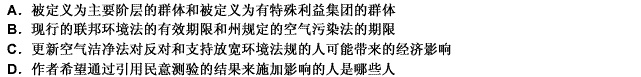 第71题美国最近一次的民意测验结果表明公众以80%对17%反对放松现在的空气污染的法规。而且,没有一个主要公众阶层想放宽环境法。这次投票的结果显示出立法者将通过投票支持更新空气洁净法,可以在不疏远任何有影响力的特殊利益集团的同时对公众意愿做出回应。下面哪条信息对评价上面陈述的逻辑性最有用?( )