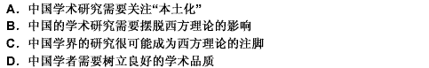 第 20 题“本土化”是近年来社会科学研究中的一个核心词汇。众所周知,西方理论对中国现代学术的发展影响至深,学者在进行学术创作时,常常会有意无意地从西方理论中寻求答案,或者套用西方理论框架解释中国的历史事实。有学者曾戏言中国的学术研究永远无法逃出西方理论的魔掌。对于完善而成熟的西方理论,我们无法视而不见,但是若将其奉为圭臬,不加思辨审慎地运用,不仅无助于学术的发展,使中国学术界的研究成为西方社会科学理论的注脚,而且也伤害了自身的学术品质。本段文字意在说明( )。