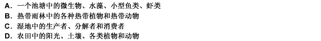 第 53 题生态系统指由生物群落与无机环境构成的统一整体。生态系统的范围可大可小,相互交错,最大的生态系统是生物圈。生态系统是开放系统,为了维系自身的稳定,生态系统需要不断输入能量,否则就有崩溃的危险。生态系统是生态学领域的一个主要结构和功能单位,属于生态学研究的最高层次。下列各项中,构成生态系统的是( )。