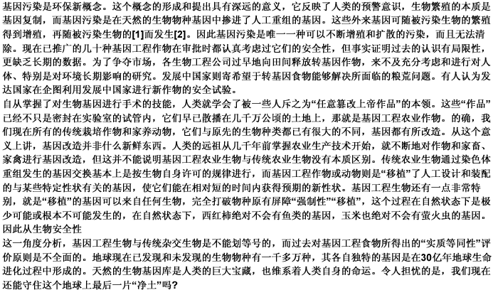 第 106 题转基因技术是一项先进的生物科学技术,这一点已在世界范围内取得共识。美国是转基因技术最先进的国家,据统计,美国的大学、科研机关和企业等已经开发出上百个转基因作物品种,其中仅有43个品种的安全性得到了美国食品和药物管理局的确认。面临转基因玉米和大豆正在进行大面积种植与大量出口以及由此引发争议的现状,美国国家科学院已经郑重承诺,将就转基因食品的安全性问题展开全面调查。看来,在发展转基因技术的同时,也是应当注意吸取任何一种现代工业技术发展过程中的教训的。