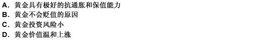 第 33 题黄金具有极好的抗通胀和保值能力。抗通胀能力是因为它本身具有价值,所以无论货币贬值还是升值,黄金原本的价值不变,只是用来计量黄金价格的货币有一个变化。还有它有一个收藏价值就是纪念币。现在黄金投资比较热门,黄金是以美元来计价的,美元一但贬值,那么黄金肯定是升值的,因为货币便宜了。黄金投资的技术含量很高,实物黄金一般情况下不会大幅波动,目前总体趋势是温和上涨的。