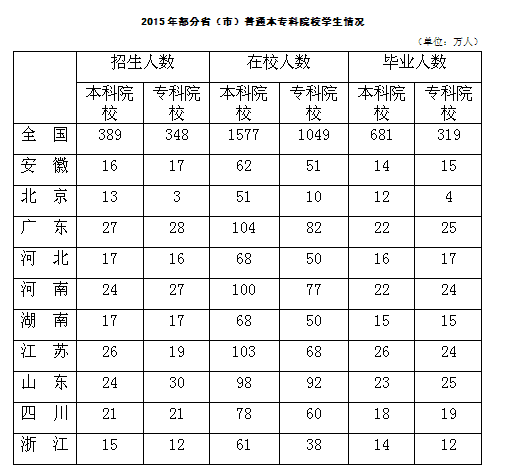 - B.2015年,河南省普通本专科院校招生总人数位列全国第一