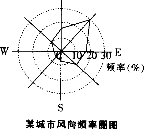 右图中“某城市风向频率圈”,该城市计划新建以煤勾燃料的火力发电厂,最合适的厂址应布局在城市的( )。
