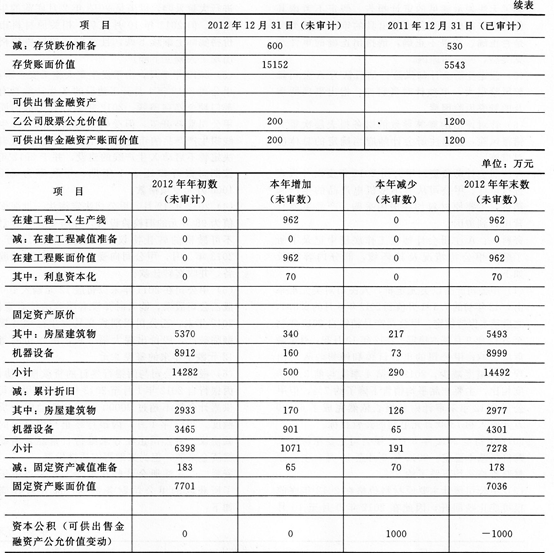 (1)甲公司产品以美元定价,人民币对美元汇率由2012年初的7.3:1升值到2012年6月的6.8:1,之后基本保持稳定。甲公司产品销售自2012年初至2012年9月基本稳定。2012年10月起,受金融危机影响,甲公司的出口订单和销售收入均出现较大幅度减少,2012年第4季度与前3个季度相比,主要产品平均销售下降了约7%,但甲公司2012年未审计财务报表依然完成65000万元收入和7300万元毛利的经营目标。2012年初至2012年8月,甲公司主要原材料采购价格基本稳定。2012年9月至1O月,主要原材料价格平均下跌了约5%。